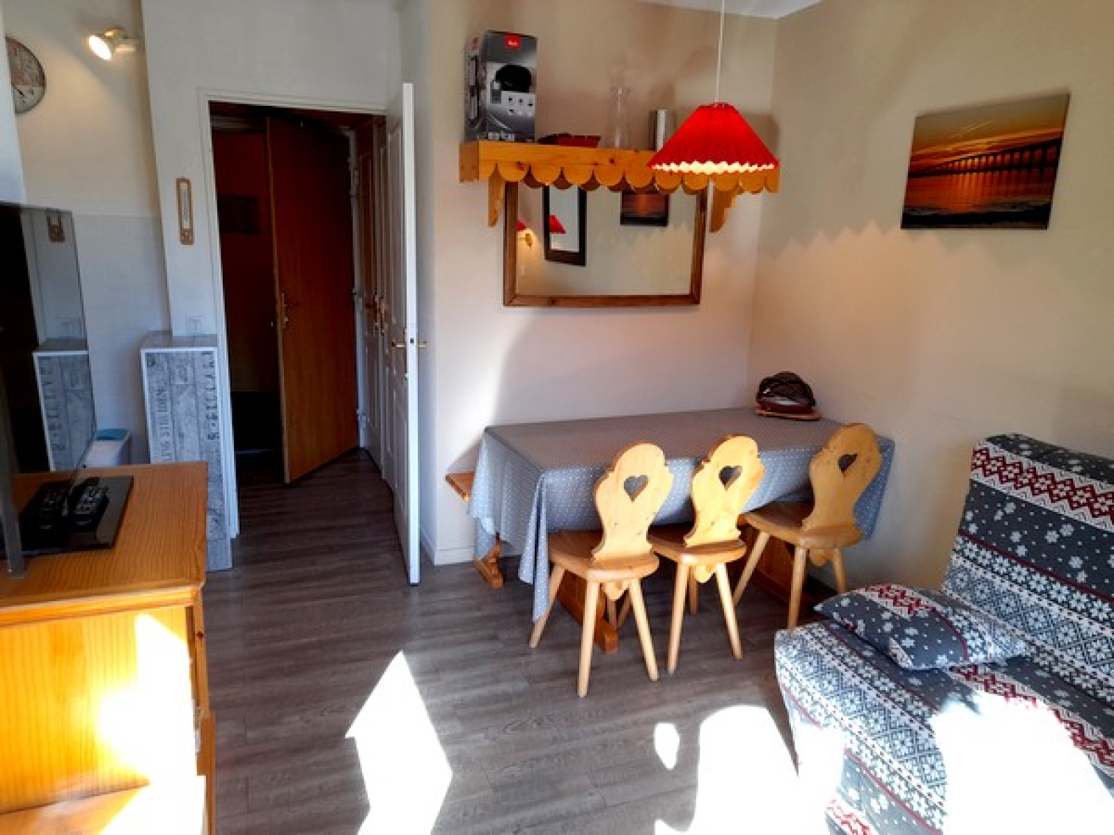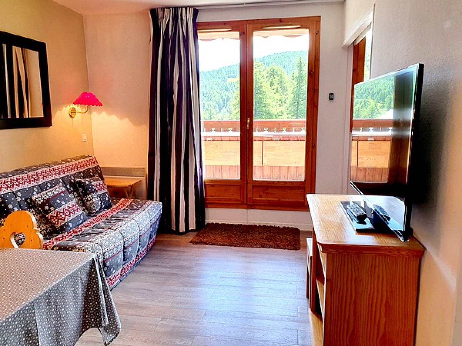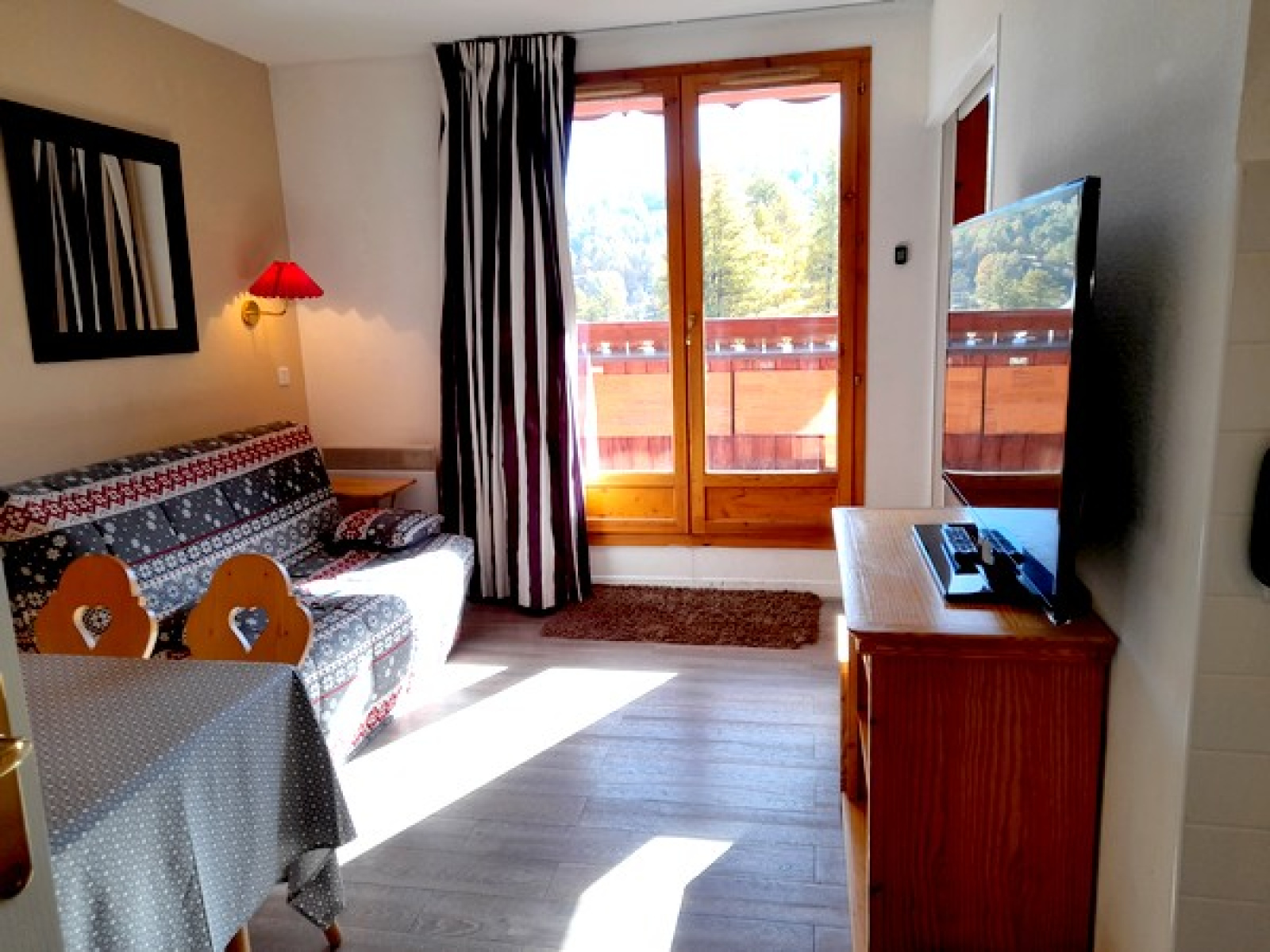 Bien équipé, il est composé de : une entrée, un coin montagne avec deux lits simples superposés, un WC indépendant, une salle de bains, un séjour avec coin-cuisine équipée, un BZ en 140cm, un balcon exposé Sud/Ouest avec jolie vue sur le domaine skiable, une chambre indépendante avec un lit double en 140cm.