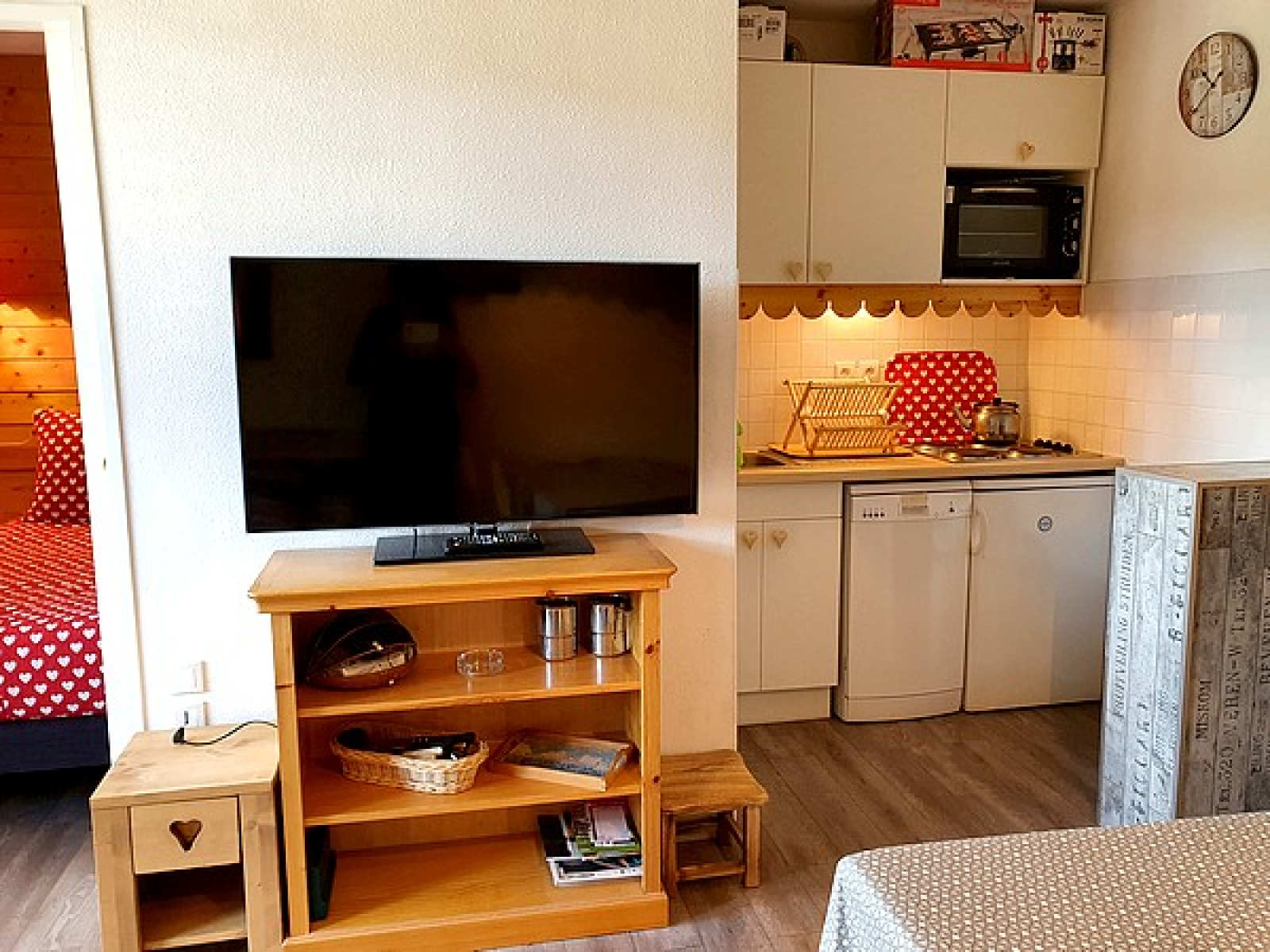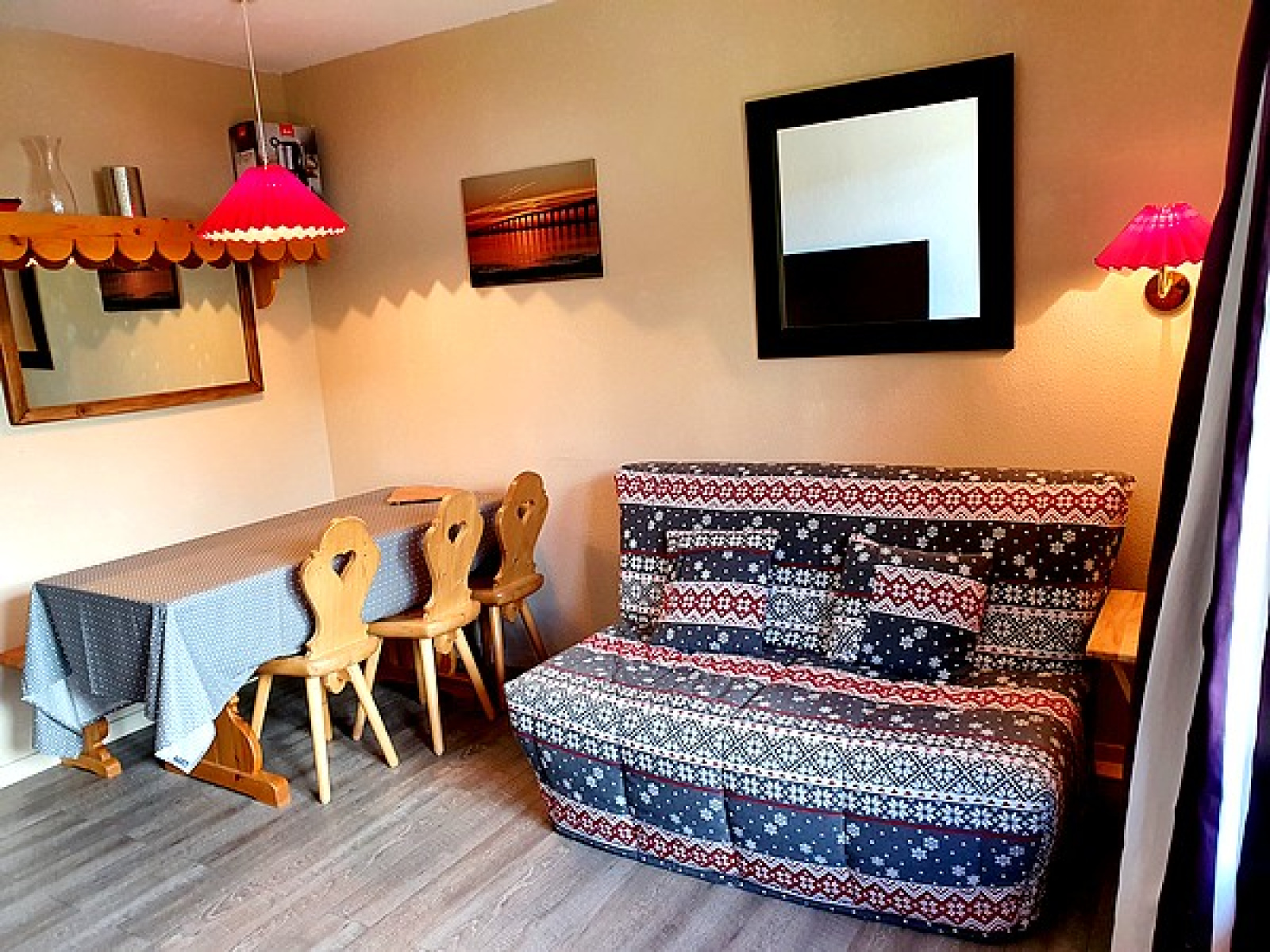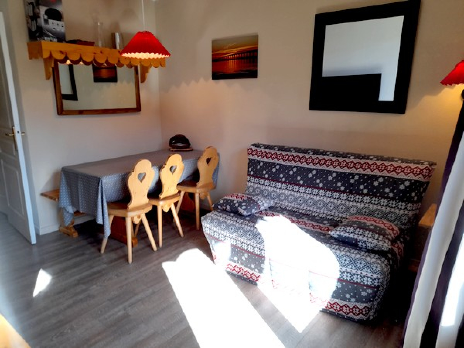 Bien équipé, il est composé de : une entrée, un coin montagne avec deux lits simples superposés, un WC indépendant, une salle de bains, un séjour avec coin-cuisine équipée, un BZ en 140cm, un balcon exposé Sud/Ouest avec jolie vue sur le domaine skiable, une chambre indépendante avec un lit double en 140cm.