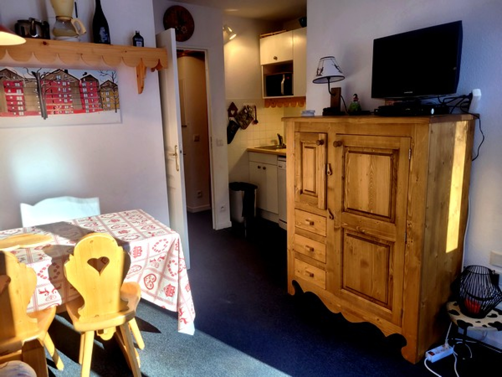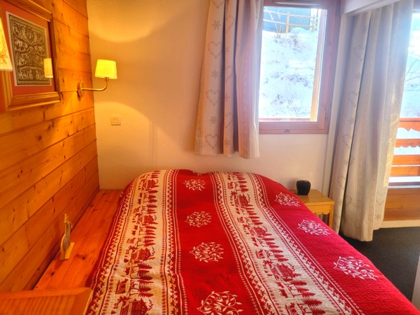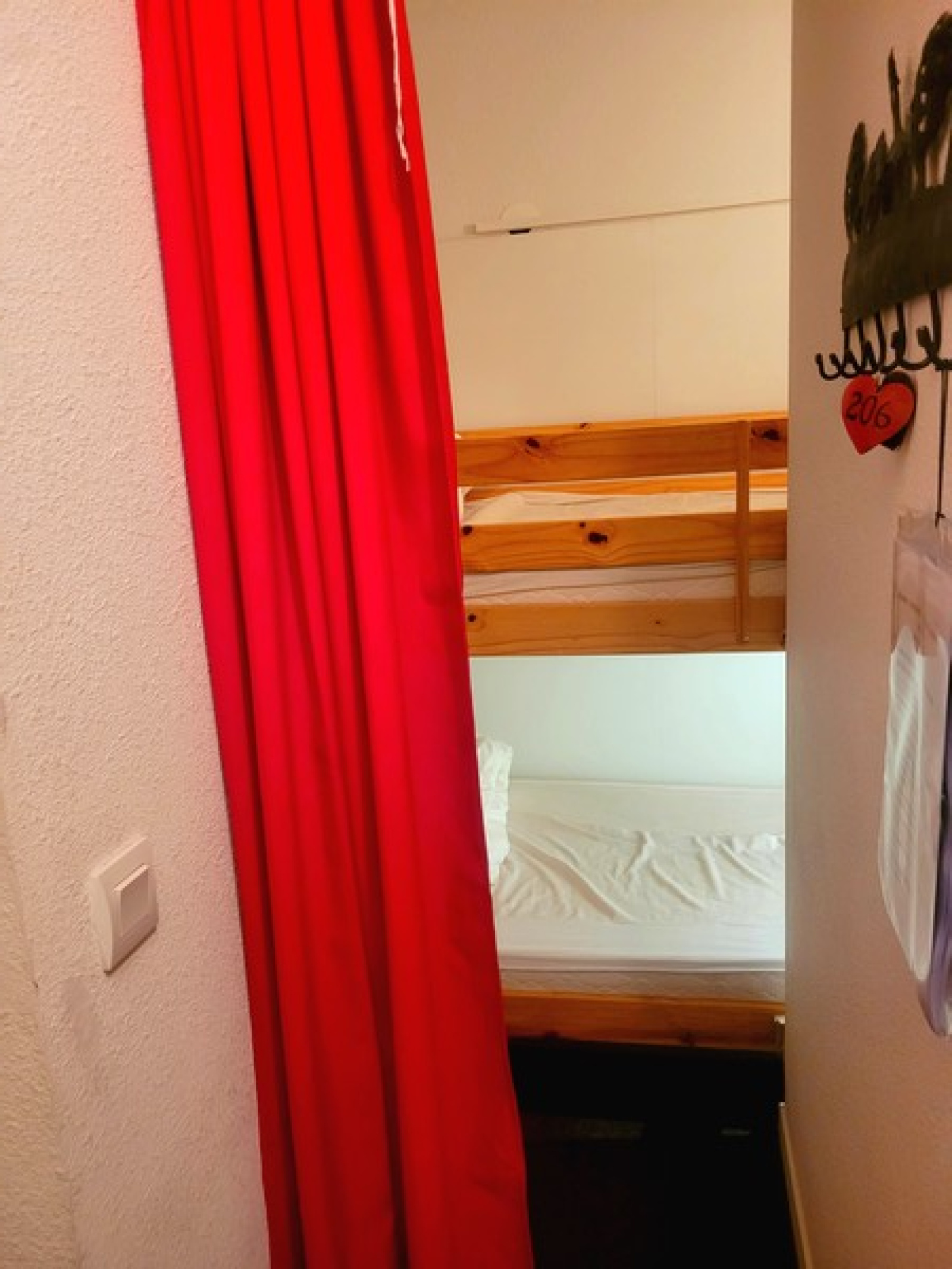 Bien équipé et bien entretenu, il est composé de : une entrée, un coin-montagne avec deux lits simples superposés, un WC indépendant, une salle de bains, un séjour avec coin-cuisine équipée, un lit gigogne (possibilité de deux lits simples accolés), un balcon exposé Sud/Ouest avec une joli vue côté montagne, une chambre indépendante avec un lit double.