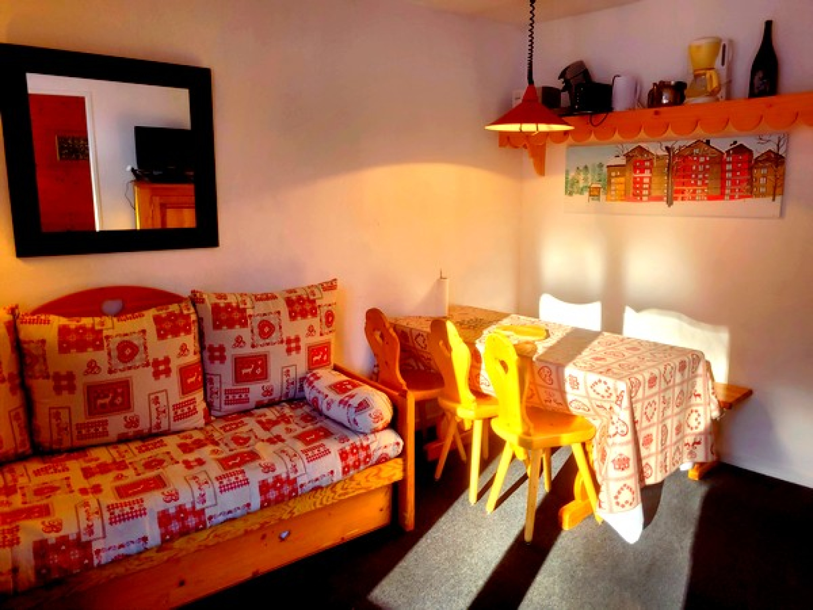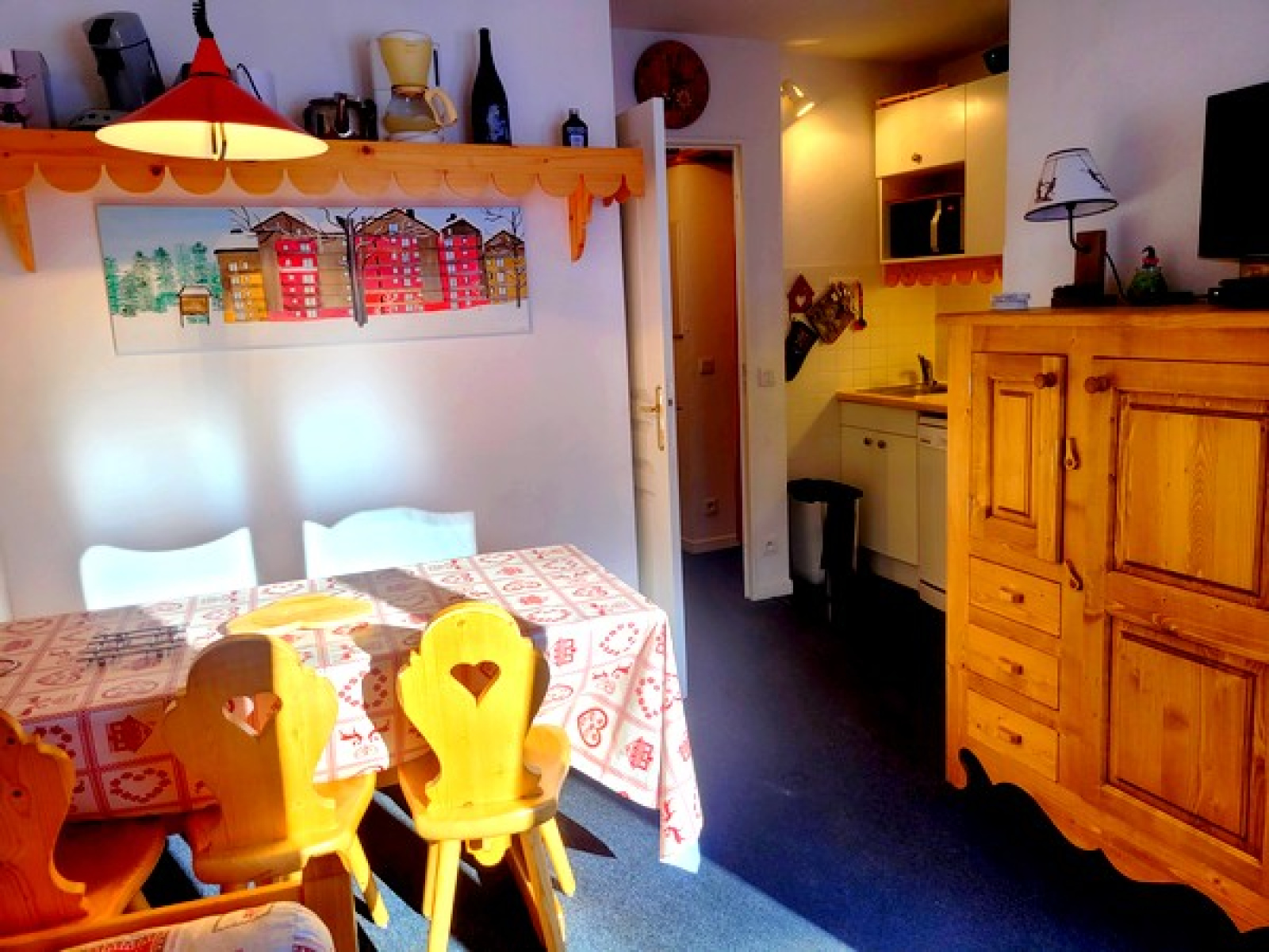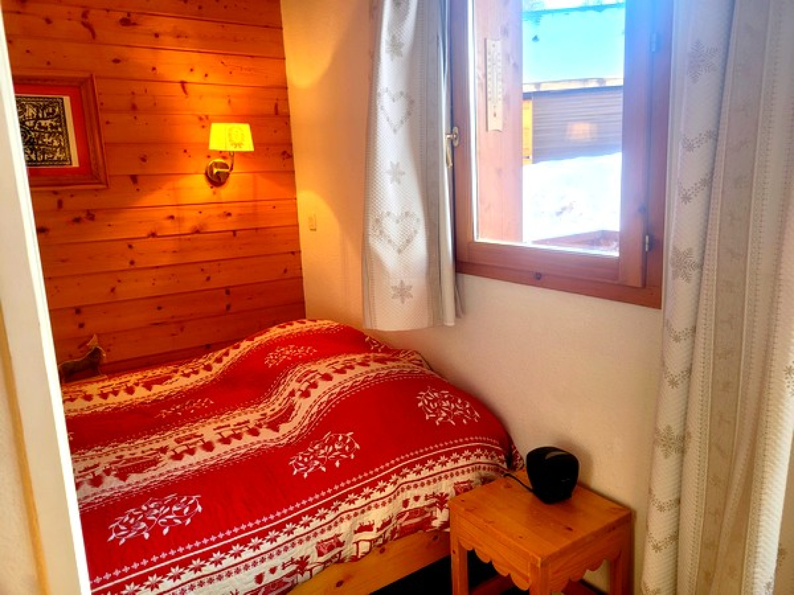 Bien équipé et bien entretenu, il est composé de : une entrée, un coin-montagne avec deux lits simples superposés, un WC indépendant, une salle de bains, un séjour avec coin-cuisine équipée, un lit gigogne (possibilité de deux lits simples accolés), un balcon exposé Sud/Ouest avec une joli vue côté montagne, une chambre indépendante avec un lit double.