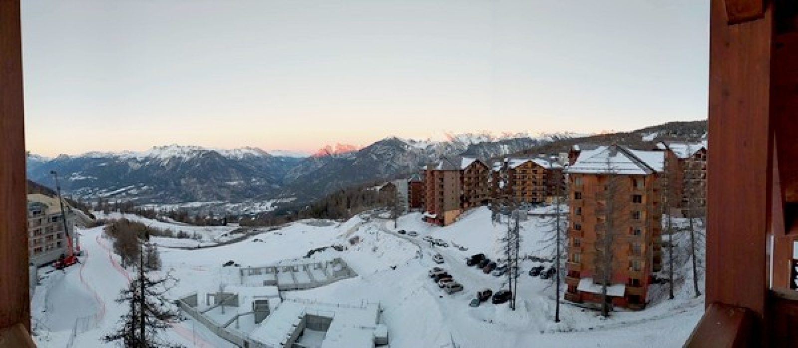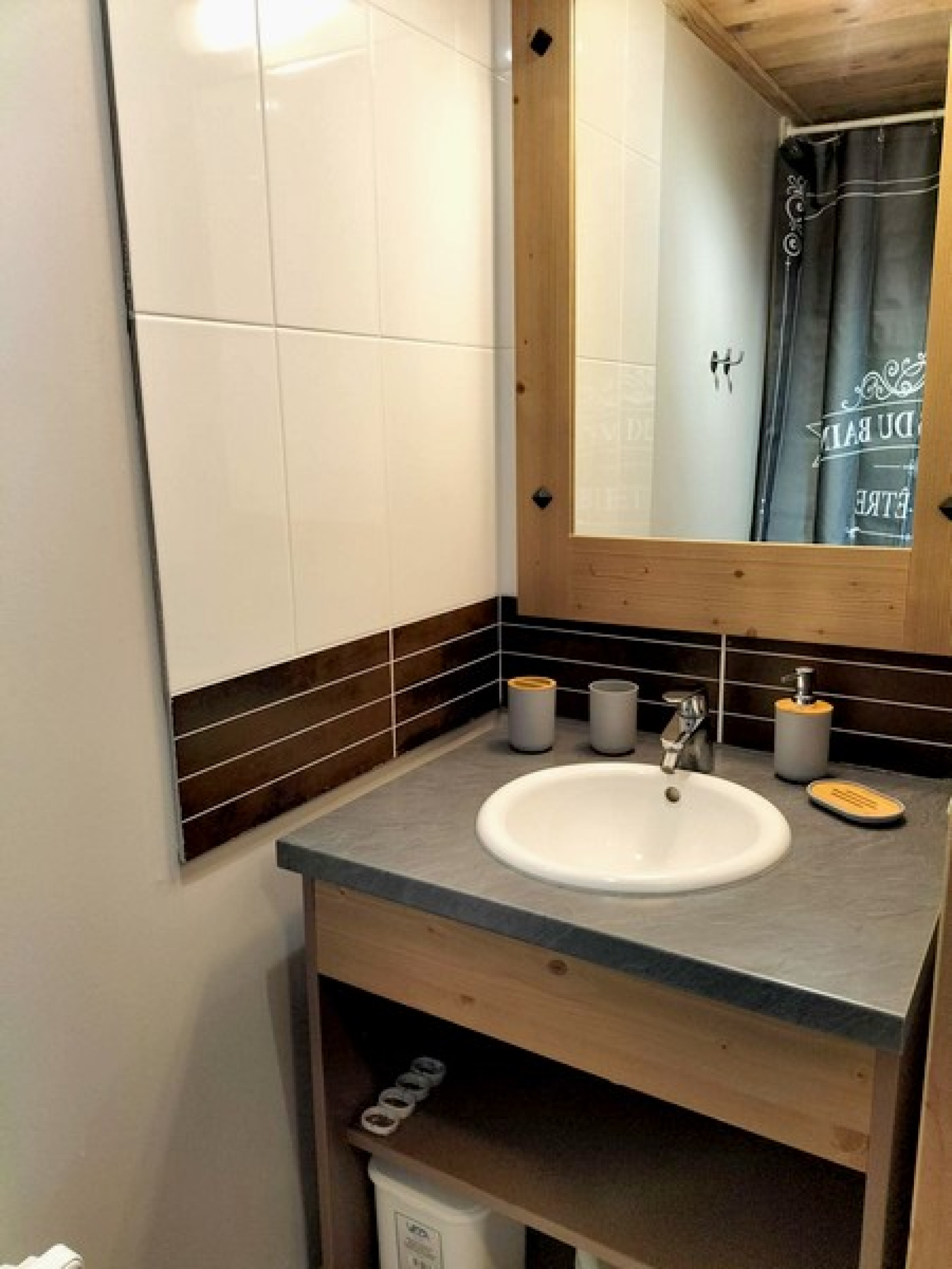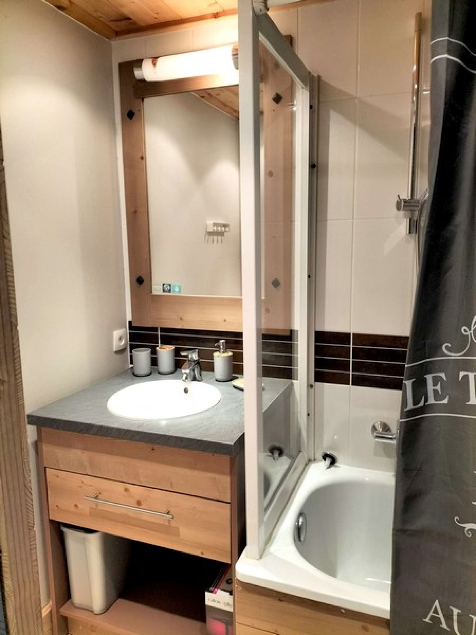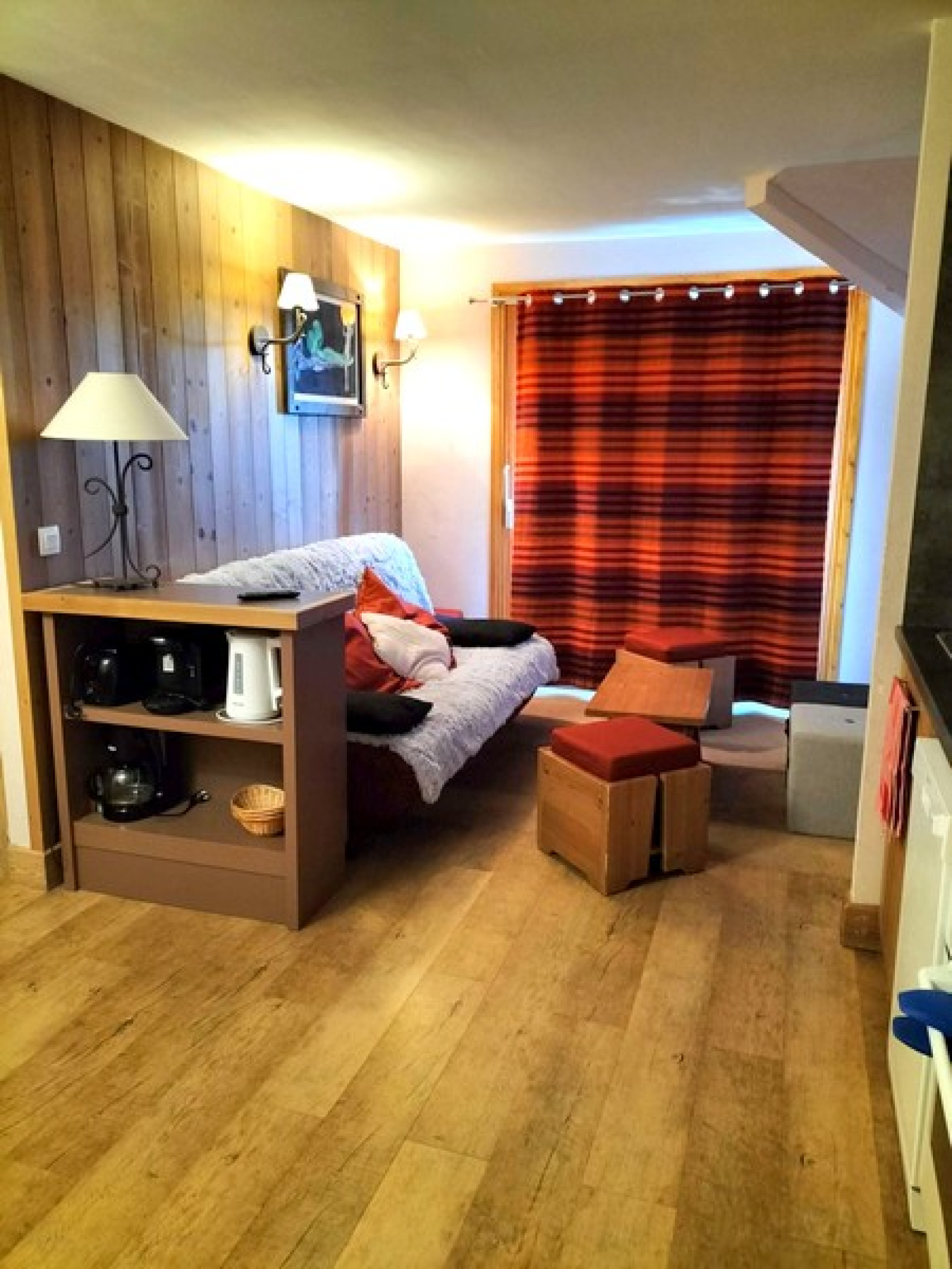 Un salon équipé d'une table basse, un canapé convertible, un téléviseur le tout donnant sur balcon avec vue sur la vallée et un coin-montagne avec deux lits simples superposés attenant à une salle d'eau.